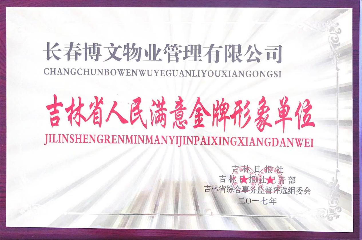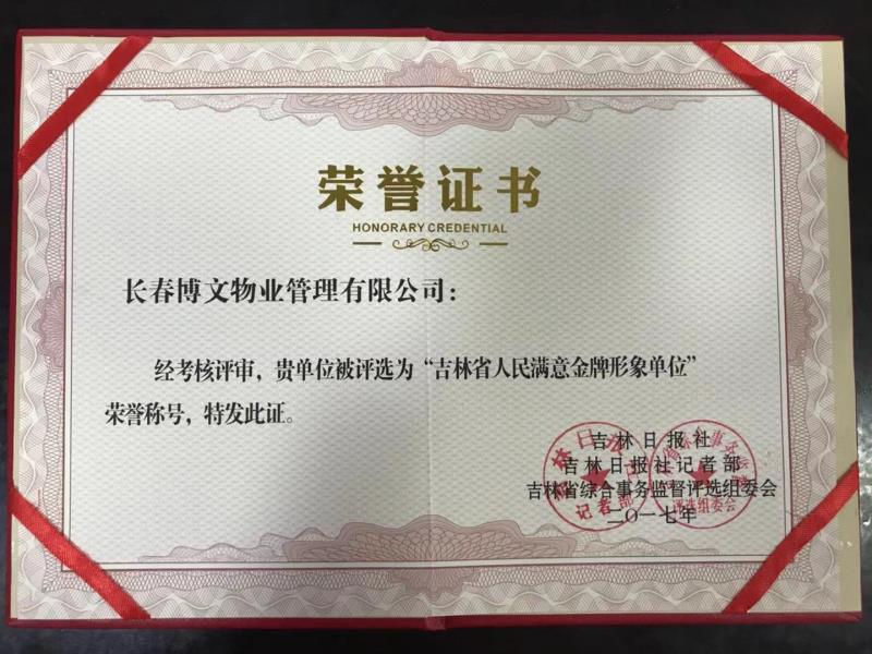2017年吉林省人民滿意金牌形象單位證書(shū)